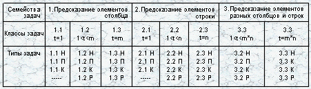 Ïðåäñêàçûâàåìûå ýëåìåíòû (b) â òàáëèöå ìîãóò ðàñïîëàãàòüñÿ ïî-ðàçíîìó.  çàâèñèìîñòè îò ýòîãî âûäåëèì òðè ÑÅÌÅÉÑÒÂÀ çàäà÷: 1) âñå ýëåìåíòû bi0 ðàñïîëîæåíû â îäíîì ñòîëáöå; 2) âñå ýëåìåíòû bj0 ðàñïîëîæåíû â îäíîé ñòðîêå; 3) ýëåìåíòû bij0 ïðèíàäëåæàò ðàçíûì ñòîëáöàì è ñòðîêàì.  êàæäîì ñåìåéñòâå áóäåì âûäåëÿòü ÊËÀÑÑÛ çàäà÷ â çàâèñèìîñòè îò òîãî, êàêîå êîëè÷åñòâî (q) ýëåìåíòîâ íóæíî ïðåäñêàçûâàòü. Ïåðâîå ñåìåéñòâî ïî ýòîé õàðàêòåðèñòèêå áóäåò èìåòü òðè êëàññà çàäà÷: 1.1) ïðåäñêàçûâàåòñÿ îäèí ýëåìåíò ññòîëáöà (q = 1) ; 1.2) ïðåäñêàçûâàåòñÿ ñðàçó íåñêîëüêî ýëåìåíòîâ (1 < q < m) ; 1.3) ïðåäñêàçûâàþòñÿ ñðàçó âñå ýëåìåíòû ñòîëáöà (q = m) . Àíàëîãè÷íûì ñïîñîáîì âûäåëèì êëàññû çàäà÷ âî âòîðîì ñåìåéñòâå: 2.1) q =1 ; 2.2) 1 < q < n ; 2.3) q = n .  òðåòüåì ñåìåéñòâå âûäåëÿåòñÿ äâà êëàññà çàäà÷: 3.2) 1< q < m*n ; 3.3) q = m*n  êàæäîì èç ýòèõ âîñüìè êëàññîâ çàäà÷ áóäåì ðàçëè÷àòü ÒÈÏÛ çàäà÷ â ñîîòâåòñòâèå ñî øêàëàìè, â êîòîðûõ èçìåðÿþòñÿ çíà÷åíèÿ ïðåäñêàçûâàåìûõ ýëåìåíòîâ. Áóäåì ðàçëè÷àòü òðè ãðóïïû øêàë: íàèìåíîâàíèé (Í), ïîðÿäêà (Ï) è "êîëè÷åñòâåííûå" (Ê). Ñèòóàöèþ, ïðè êîòîðîé ïðåäñêàçûâàþòñÿ ðàçíîòèïíûå ýëåìåíòû îáîçíà÷èì ñèìâîëîì (Ð). Îïèñàííàÿ êëàññèôèêàöèÿ çàäà÷ àíàëèçà äàííûõ ïðèâåäåíà â Òàáëèöå 1.
